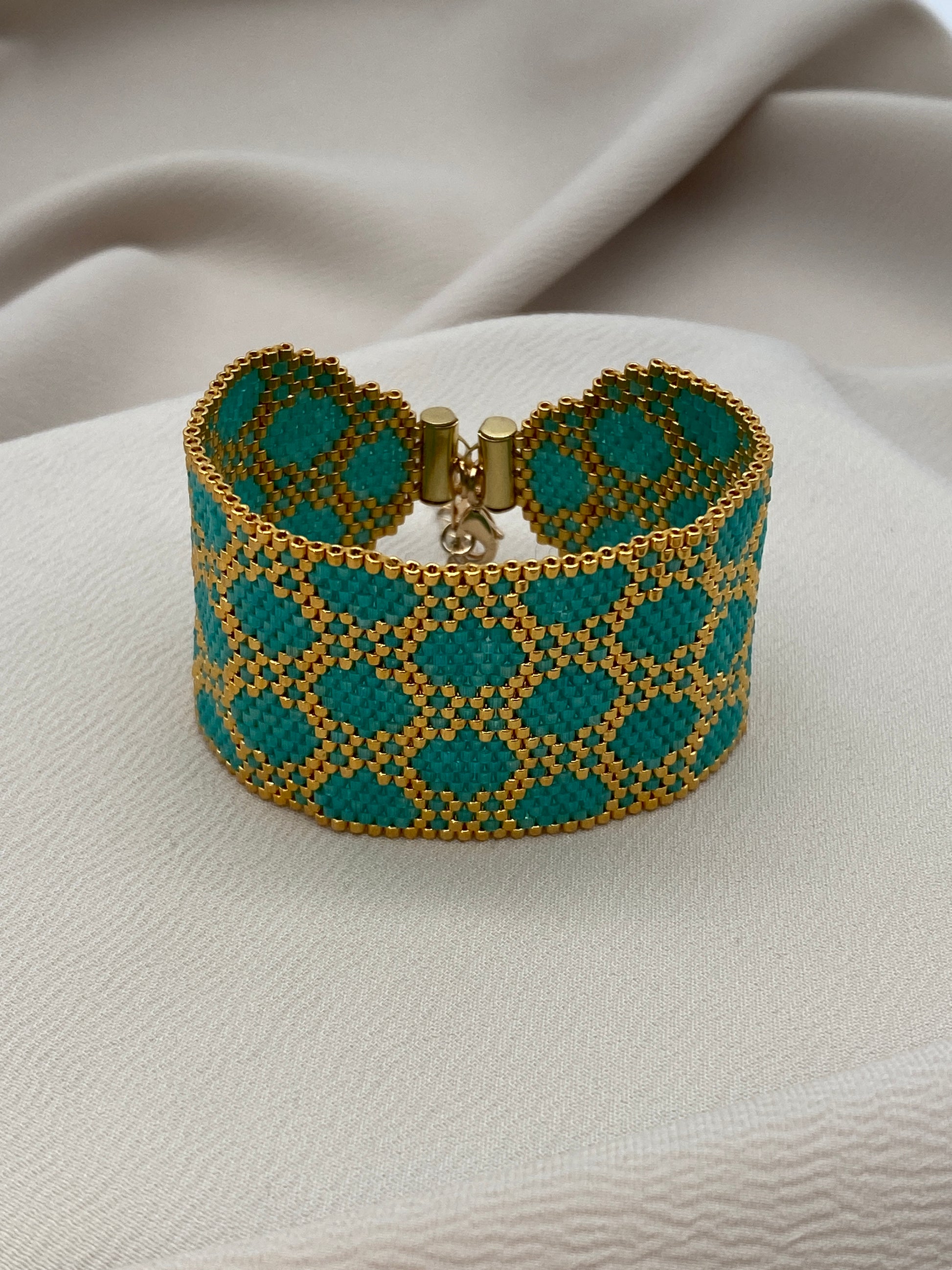 Instant download (PDF file) of a “Gold Turquoise Satin” bracelet pattern.